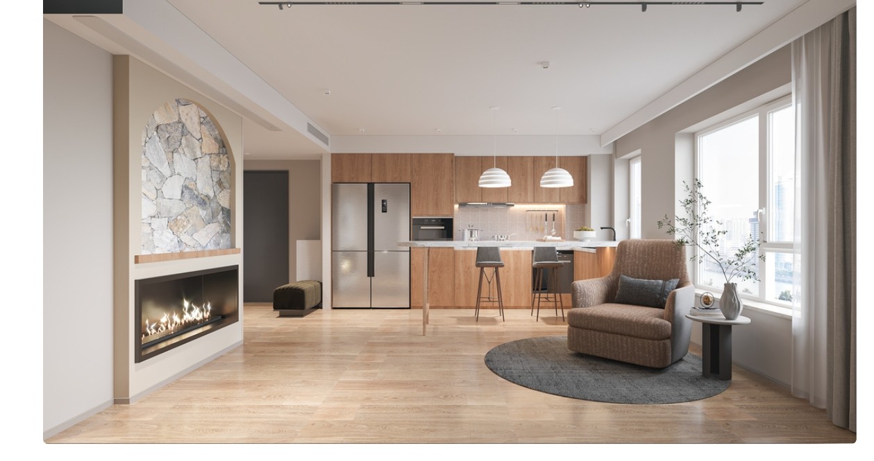 客厅采用新建轻墙体的手法,起到收纳和背景墙的作用。相较于玄关区域的极简,客餐厅更多木色与多元材料的加入,使得就餐区与客厅区域和谐共容,又有一种恰到好处的层次感与饱和感。
