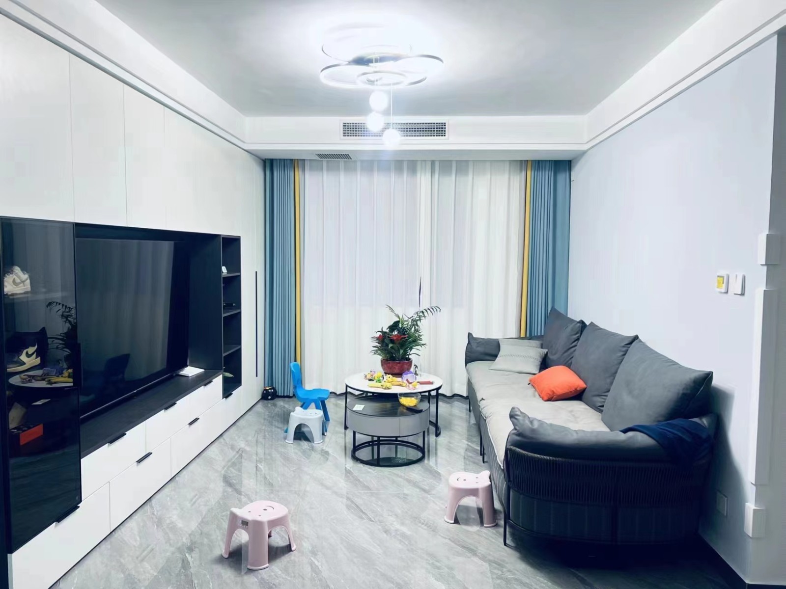 客厅采用简约现代装饰风格,吊顶设计双眼皮吊顶,既满足中央空调主机空间需求,同时与电视柜互动,满足多种功能