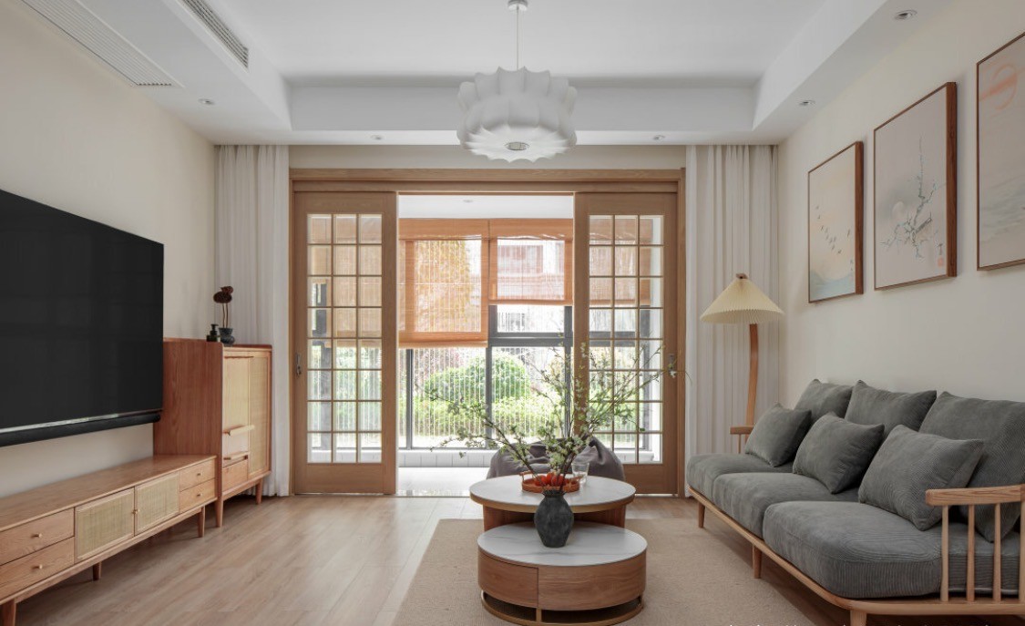客厅与阳台选用网格木色推拉门隔断,既有颜值,又富有韵味