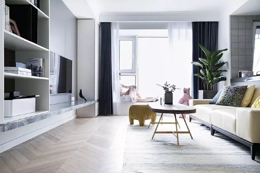 客厅设计整体保持简约, 在局部则通过色彩和软装进行调和, 圆角茶几质感自然温润, 搭配金属桌腿又不乏精致。
