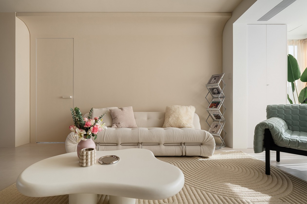 弧线的温柔磨平了岁月的棱角,造型墙的空格里激迸出繁星点点, 木的纹理是大自然对岁月的洗礼与微水泥的结合在温润了空间,跳跃的色彩家具点亮了空间的活跃。