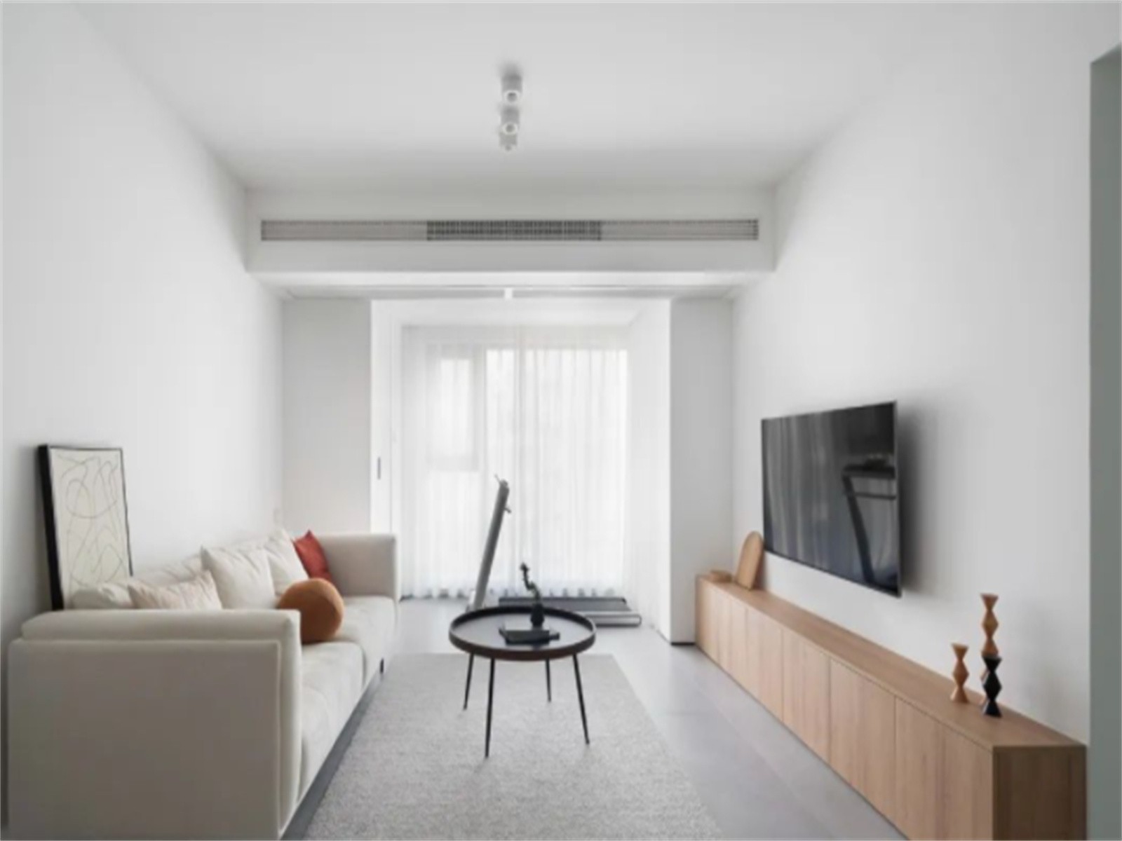 客厅纳入阳台,扩大使用面积与采光,靠落地窗摆放跑步机规划为健身区,定制木色电视柜为简约的空间带来些许暖意