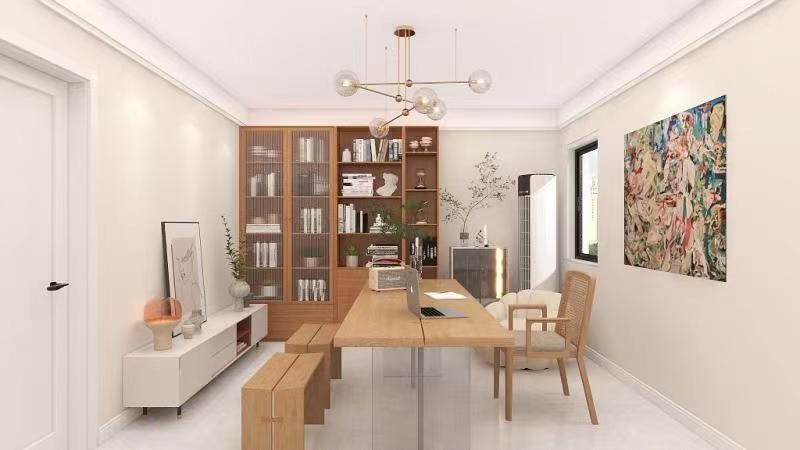 客厅应业主要求设计成工作台,墙角的大书架让整个客厅显得典雅书香气质