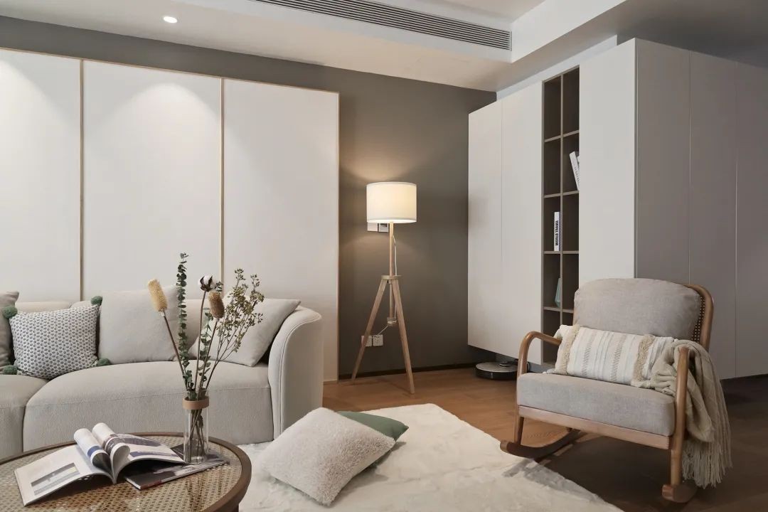 客厅设计以白色为主,搭配棉麻质感软装干花更突显风格