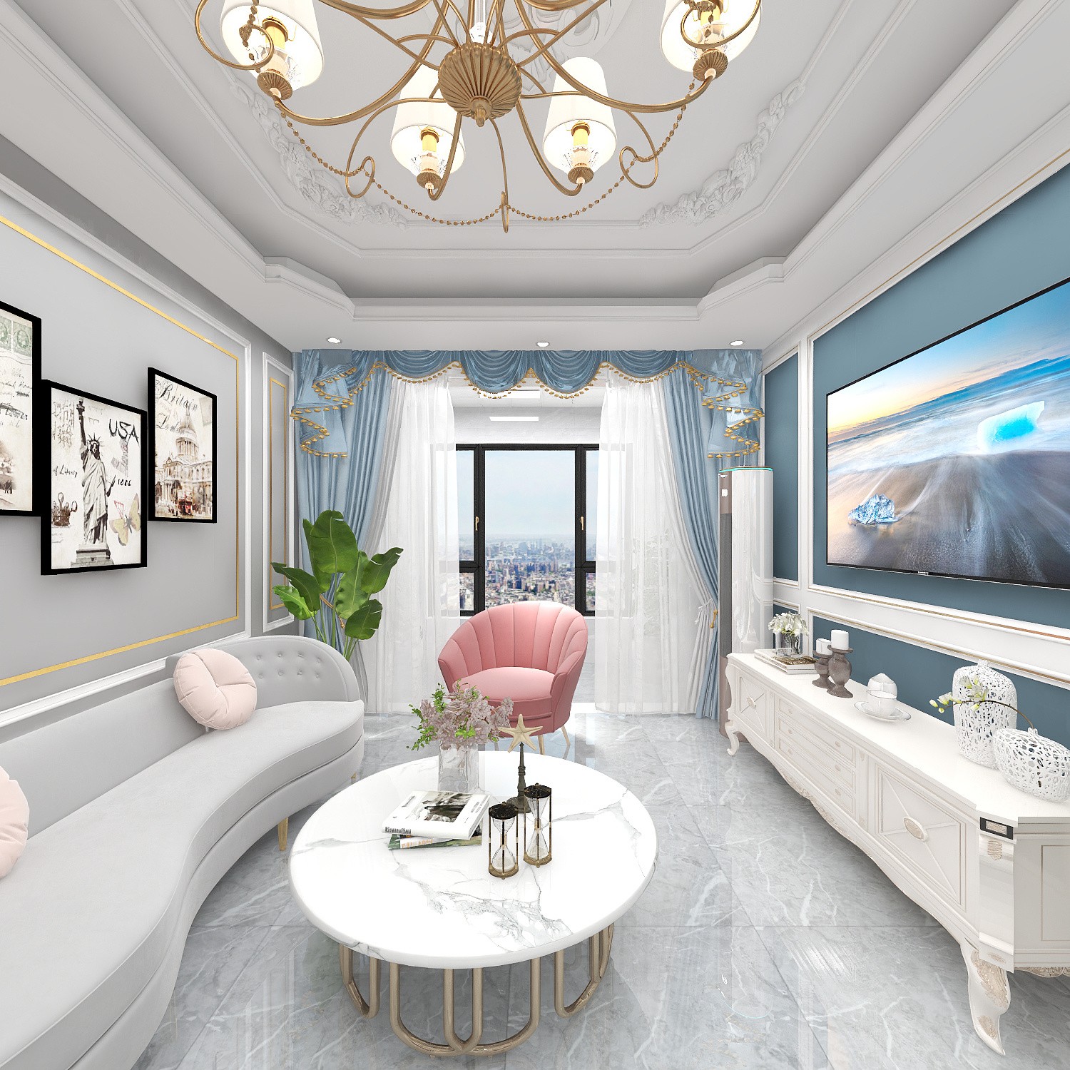 美式风格,电视背景墙运用石膏线与蓝色乳胶漆的结合