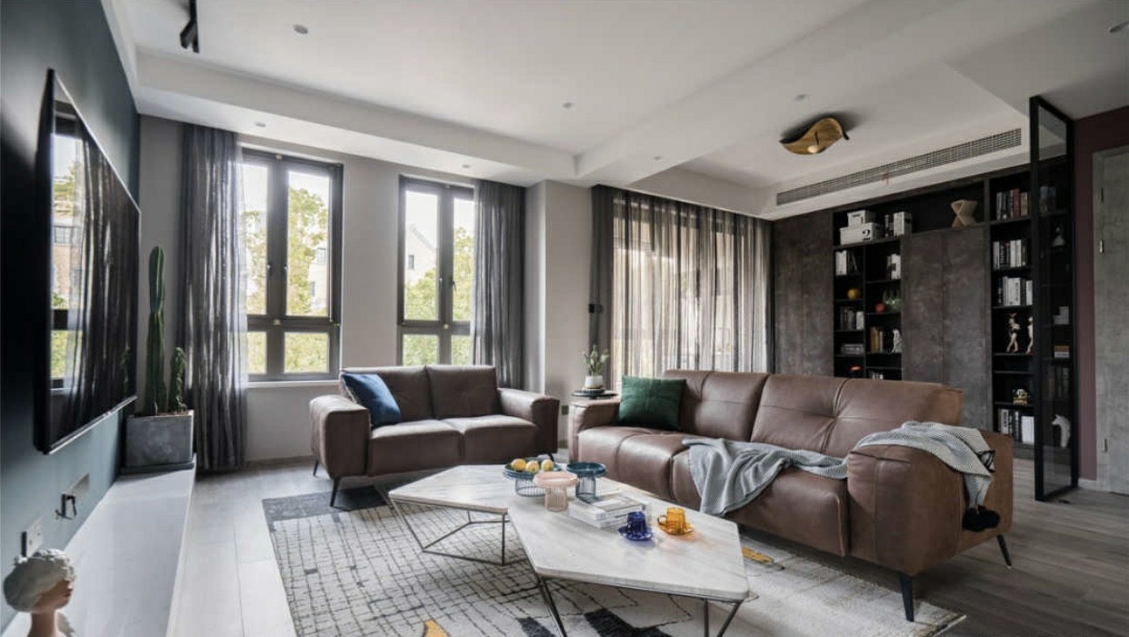 电视背景墙采用大面积莫兰迪蓝做打底,为避免空间色彩的杂乱,舍弃了电视柜,采用白色大理石瓷砖垒砌200mm×450mm×3200mm的地台,简约大气。