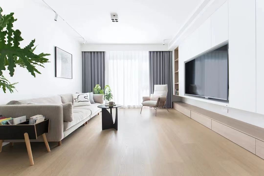 墙漆选用了浅暖灰色,与定制柜的白色和地板的木色,都能很好的搭配。