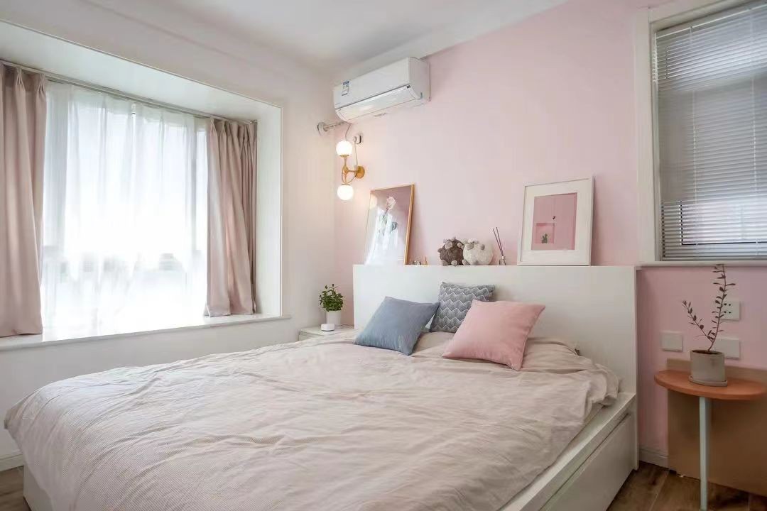 主卧少女心炸裂,粉色的床头简约与浪漫两种气息,在主卧空间和谐共处。