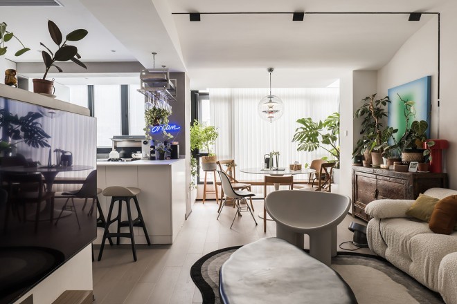 另外一侧的墙面做了顶天立地的开放式书架,不 仅彰显着屋主的审美、阅读品味,丰富多彩的书脊以及生机勃勃的植物成为墙面最出彩且有生活气息的装饰