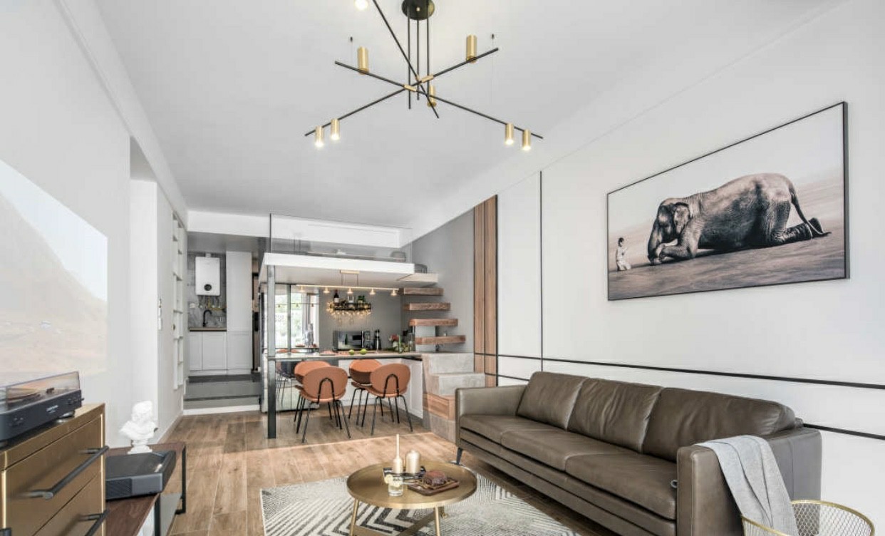 房子的改动还是比较大的,原本的一室分割成了两室,还增加了一个衣帽间,而客厅也做成了下沉式的客厅并且在餐厅上方做了一个高低床式的休闲区。进门处的厨房隔墙也打通了