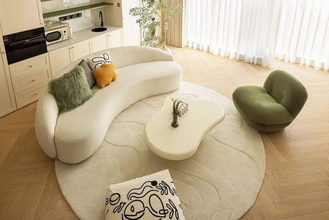 地面通铺鱼骨拼木地板,选择弧形主沙发搭配绿色的单椅,清新脱俗的空间配色。圆形短绒地毯自带温润优雅质感,法式的浪漫感沁润空间。