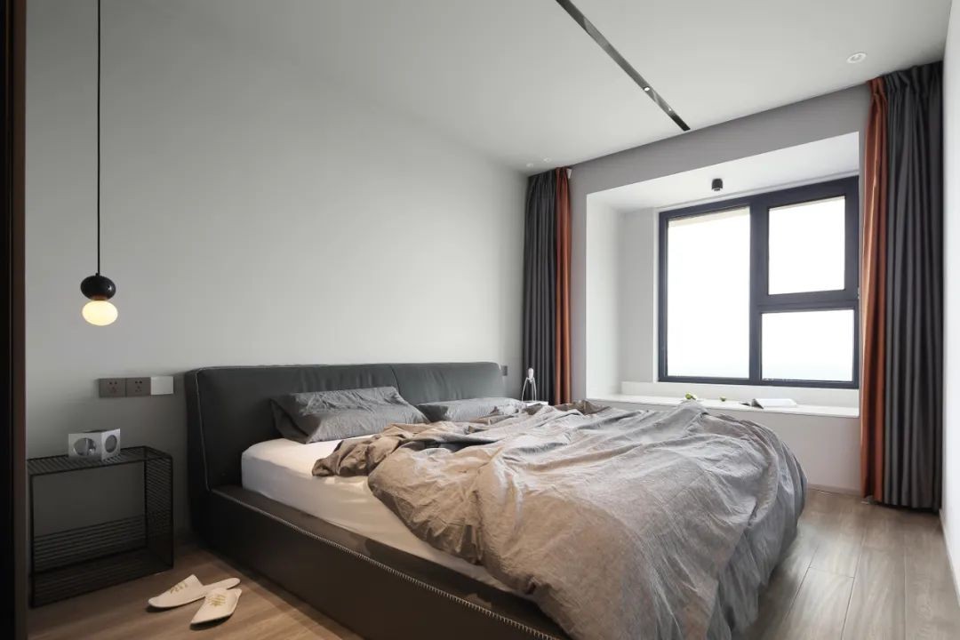 主卧,以大面积的灰色块为基调,搭配黑色家具,增加空间的厚重感,窗帘局部加入橘色点缀,打破黑白灰的清冷。