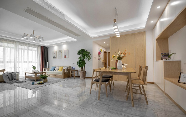 装饰画和窗帘选了朱红色,用以点缀,让整个空间鲜活起来,也不会显得太过于素雅单一。
