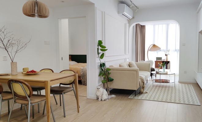 原客厅设计改造前客厅就是一张L形的大沙 发加-张餐桌放置在沙发边上,整个空间昏暗拥挤,设计后把沙发后面的墙拆除引光入室,照亮整个客厅区域,餐厅与客厅都是独立的区域,整体通透宽敞,动线流畅。