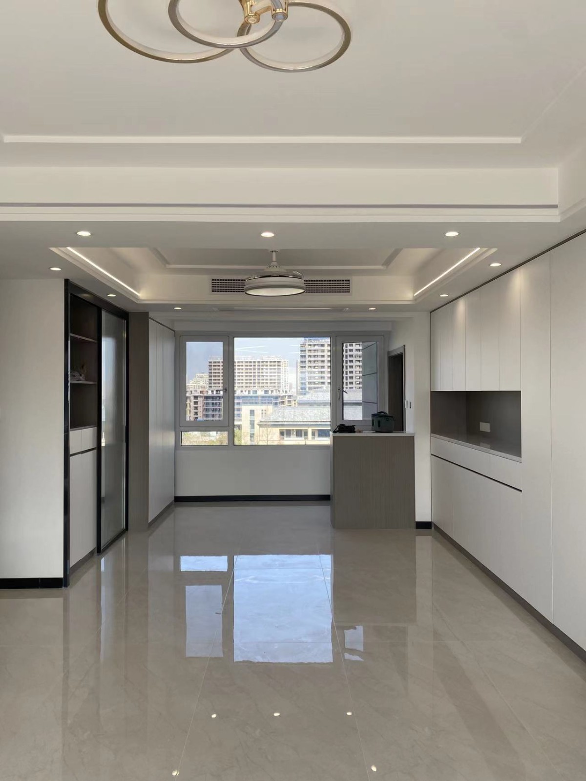 入户玄关小鞋柜 进门正对面一整面的储物鞋柜 整个客餐厅的柜子 全部暗拉手和无拉手的设计 整体一清二白