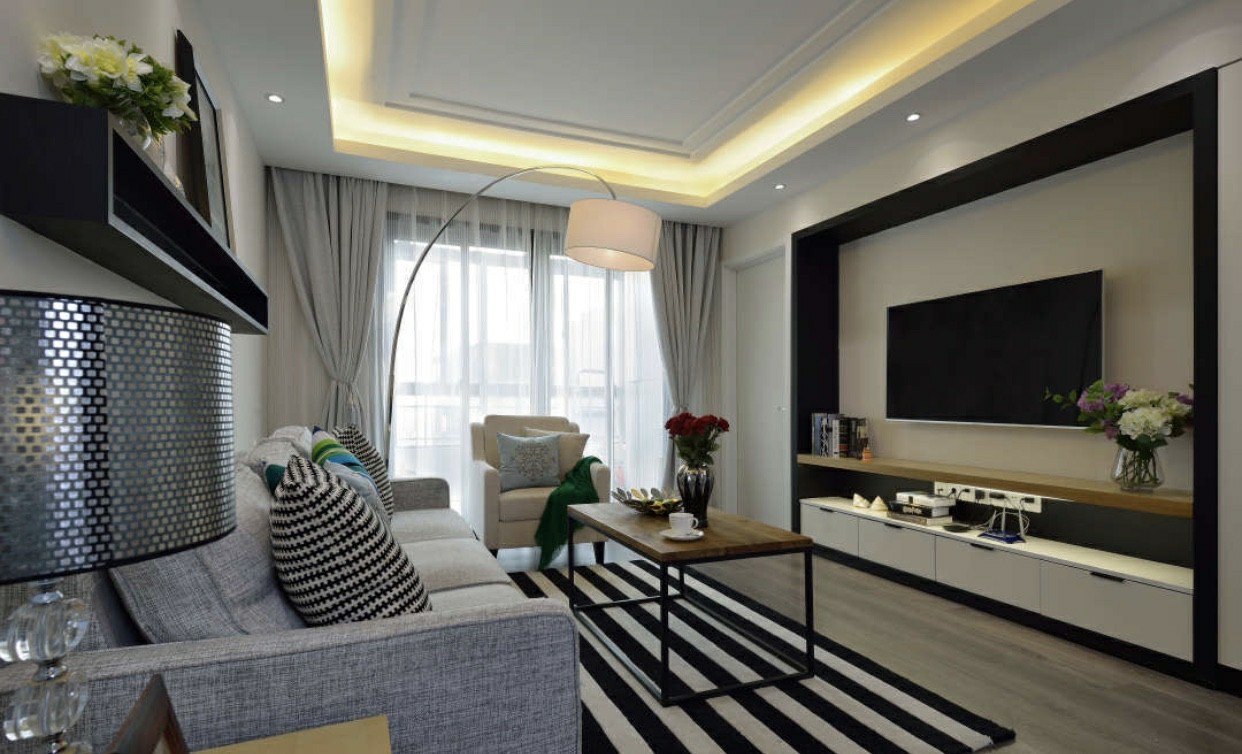 电视背景墙没有选择过多的去装饰它,以免喧宾得主,黑色边框与整个空间的黑色踢脚线相呼应,整体看起来比较和谐。