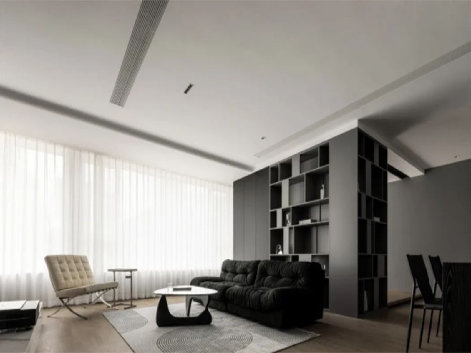 客厅,原木地板搭配无主灯顶面,整体空间以黑白灰为基调,***简约的设计,让空间尽显品质细节