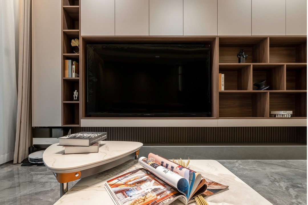 电视背景选择了电视柜的形式,封闭式和开放式的组合柜,收纳格局和收纳形式更加丰富。开放的格间可以用来摆放装饰和摆件,为电视背景增添更多装饰空间。封闭式收纳,容量丰富,补充了家中其他区域的收纳功能。