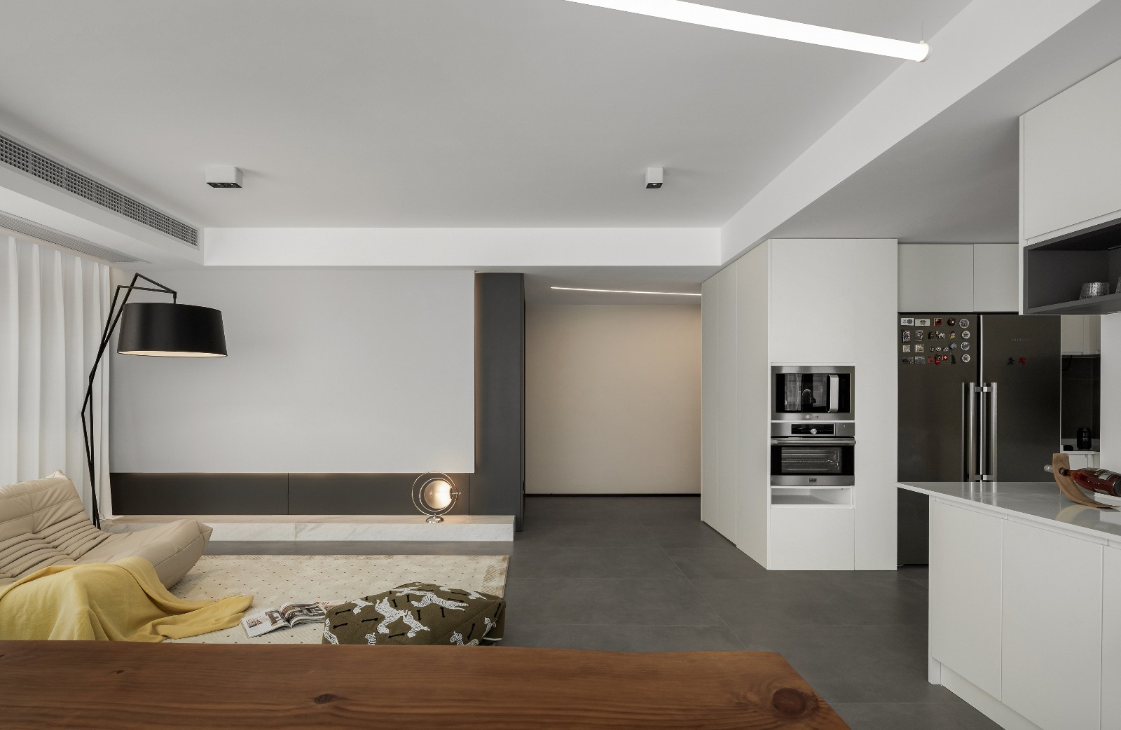 极窄边框的大落地玻璃把江景收入“画框”,室内外的互动让居家美学呈现出自然的艺术。大横厅的顶上斜吊一道光柱,从厨房门口延伸至长桌尽头。水泥灰的地砖铺陈出极简精致生活的底色。“毛毛虫”沙发背后矗立的投影仪代替电视机为生活增添了欢乐的剧情。