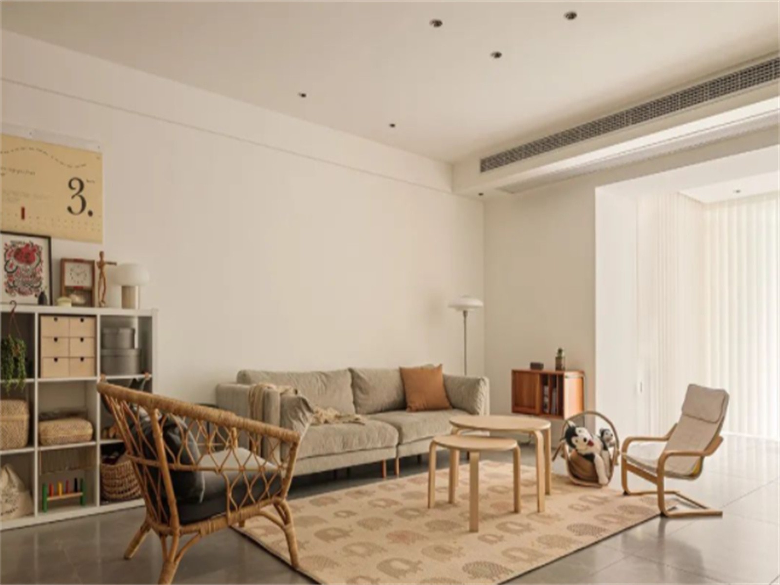 客厅无过多装饰,灰砖地面+无主灯吊顶,家具选择可以随意挪动的,方便随时切换客厅模式