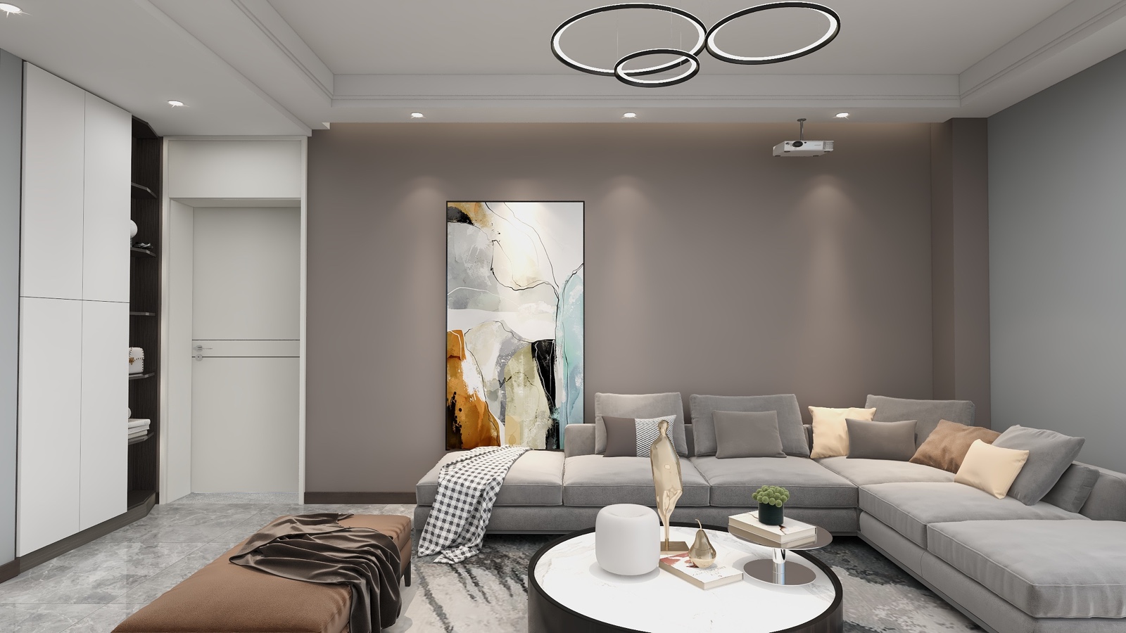 客厅不用电视,考虑做幕布投影,墙面主题以白色为主,背景色乳胶漆调色