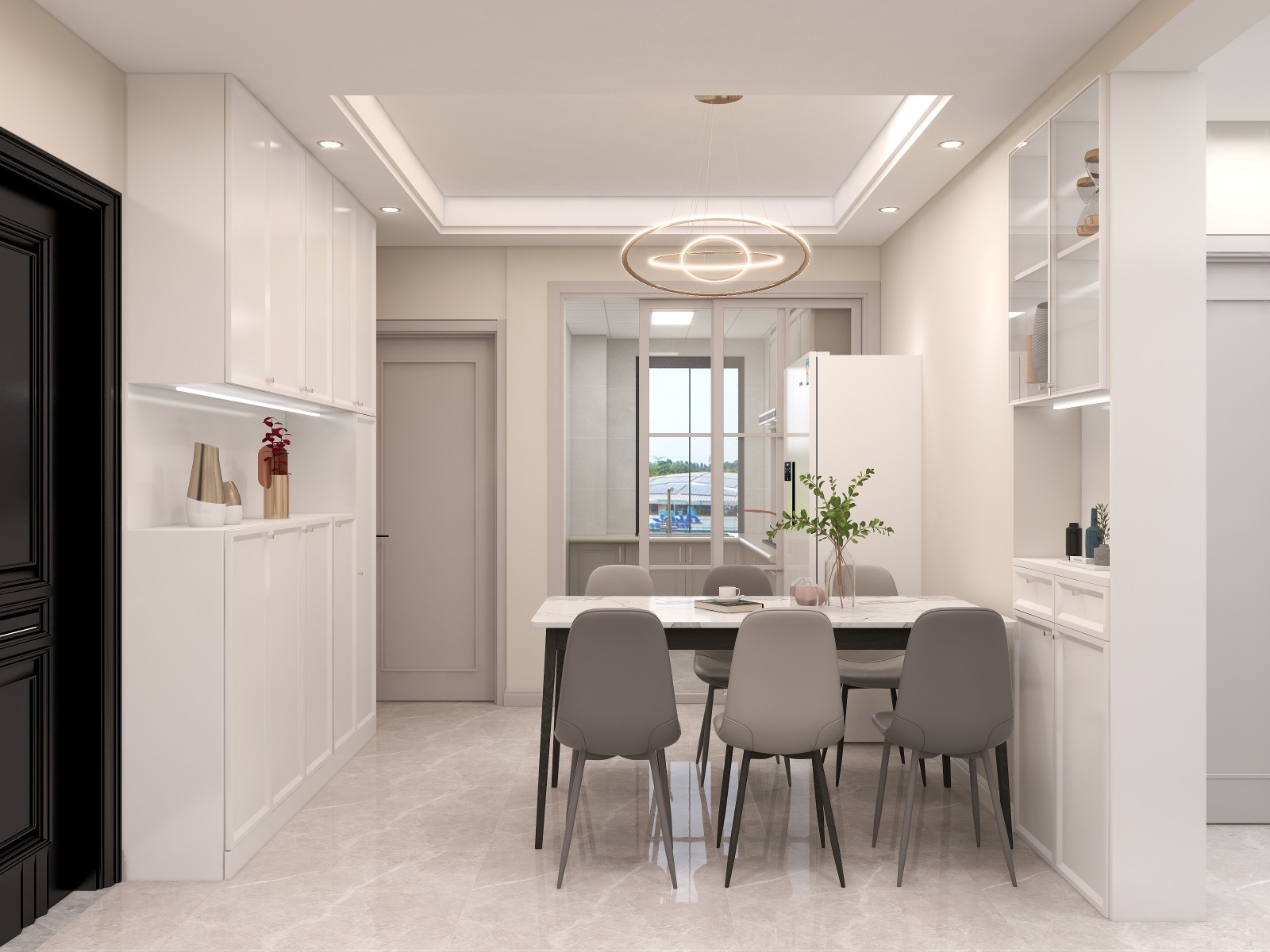 户型不是很方正,客厅,餐厅做了分化空间,鞋柜,玄关柜,筒灯的微光能体现出很温馨的一个就餐氛围