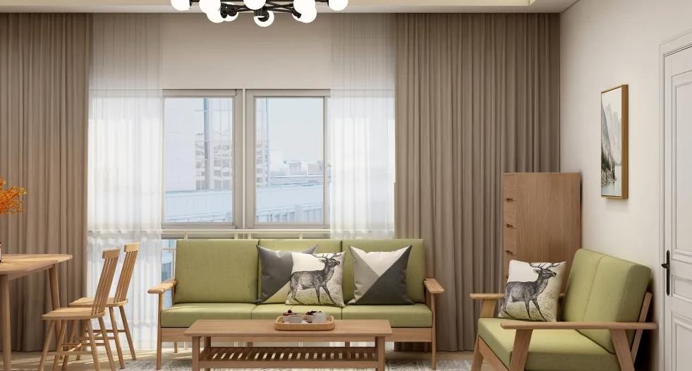 客厅墙面墙漆采用的是白色,家具搭配的是原木色和绿色,看起来很温馨