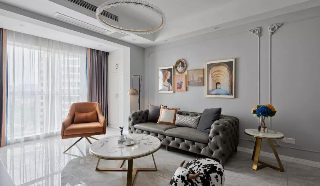 轻松迷人的橙赭色,点缀在大片的鸽子灰色调之上,金属、皮质、大理石、水晶灯材质互作搭配,呈现时尚摩登的观感。