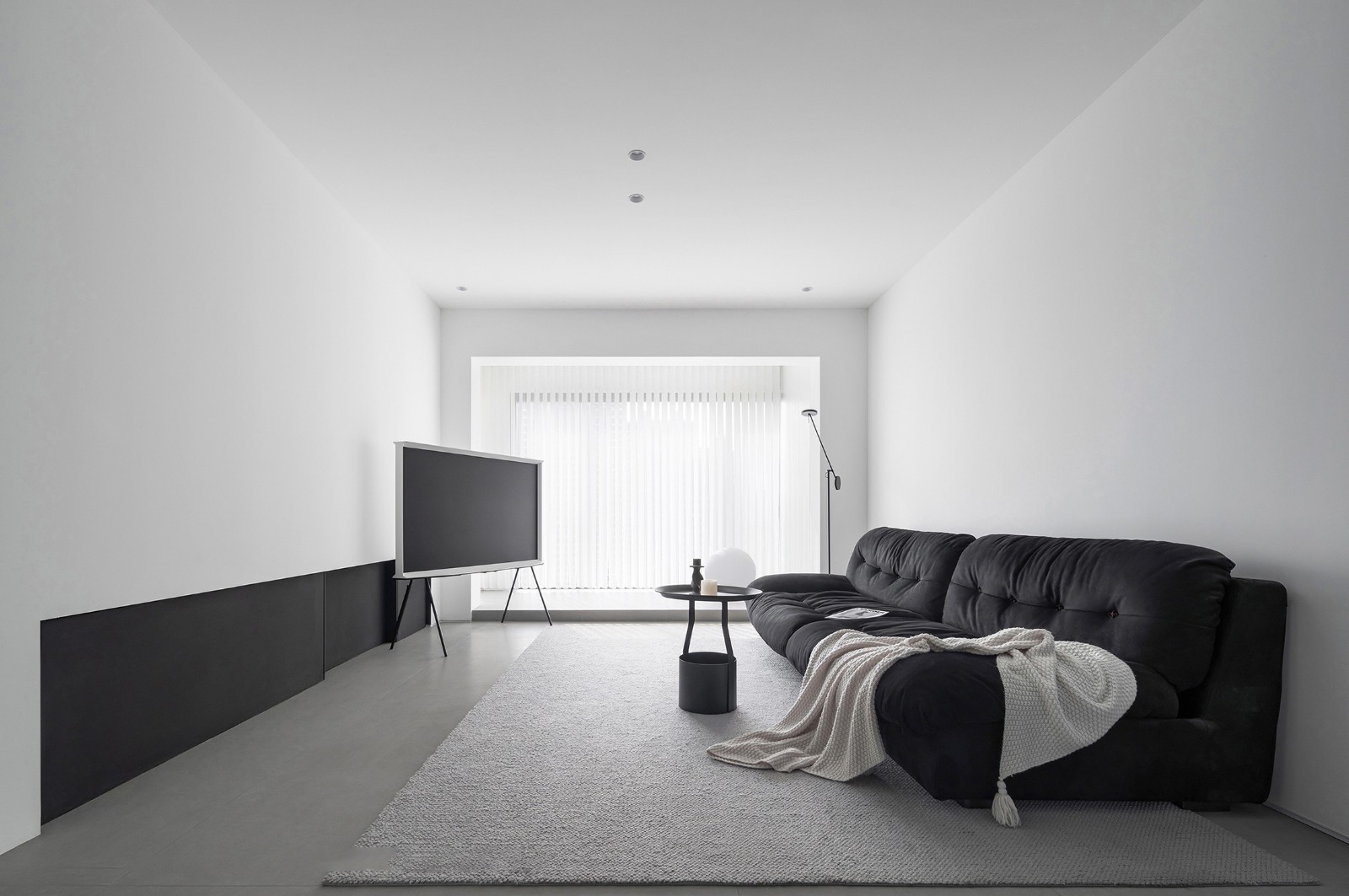 无主灯、吊平顶,哑光地砖搭配现代黑白灰的家具,给人以冥想放松的环境。阳台纳入到客厅区域,稍稍做了一个抬高,以地台形式来区分空间。
