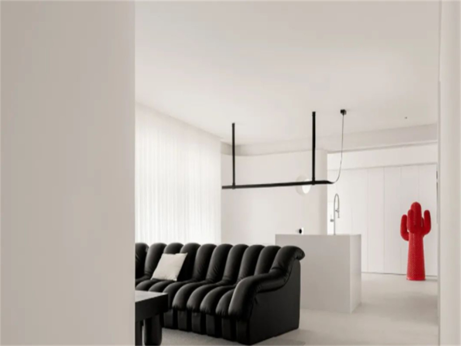 整屋无踢脚线设计,选择暗黑系艺术造型家具,竖条百叶帘确保空间私密的同时柔化光线