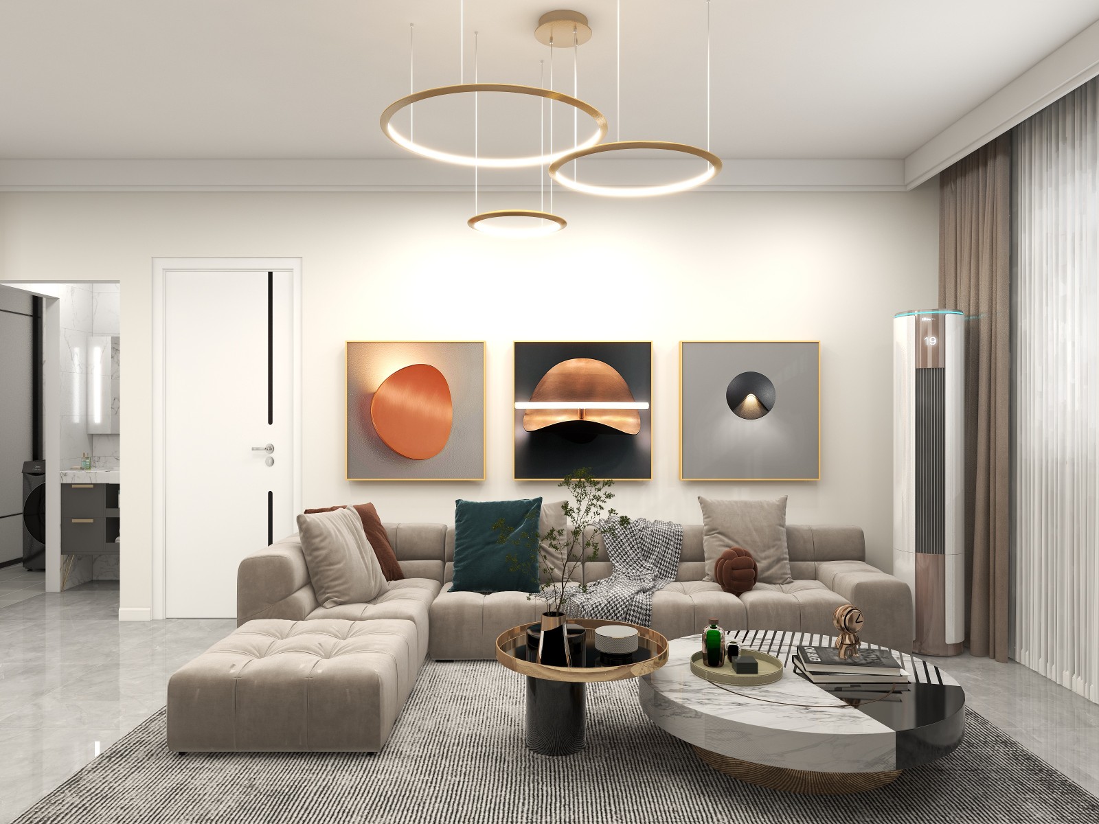 客厅的沙发和挂画颜色形成呼应,茶几,挂画,吊灯的金属线条搭配凸显主题,现代轻奢风的感觉~