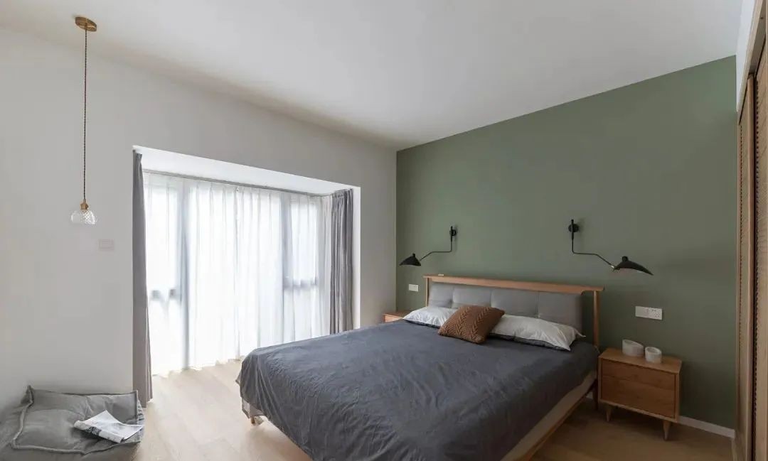 主卧,床头背景墙涂刷牛油果绿的墙漆,搭配原木家具,加上无主灯设计,更有助于睡眠。