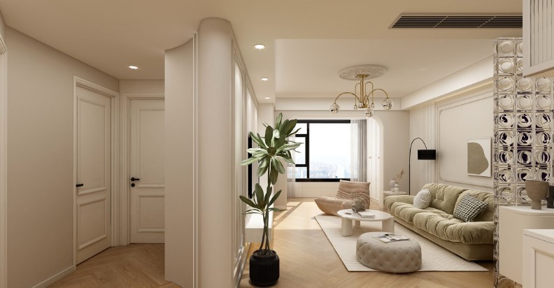 以人字纹木地板为基底,墙上的PU线条与地板呼应,放上一张优雅休闲的粉色沙发与浅灰色地毯,时尚大气的巴黎氛围便一秒沾上,过道墙的主色,除了综合家中的颜色外,更大大增加了屋主收纳的需求。时尚的单椅、跳色的抱枕与造型感十足的人像摆设,放上一张桌子、灯具,便能成为舒适的多功能空间,简单的软件搭配,也顺便提升了屋主的休憩功能。