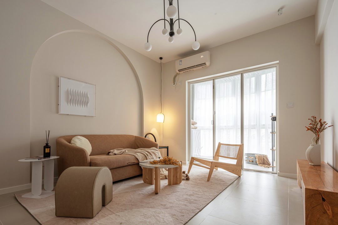 全屋都用了奶咖色的墙漆,通过暖光的营造,整体出来更温馨;墙身拱形并非为了做而做,实际原来是右侧有一个凸出来的柱位,为了将柱隐藏又不影响紧凑的客厅空间面积,将柱子做成了拱形的对称关系,