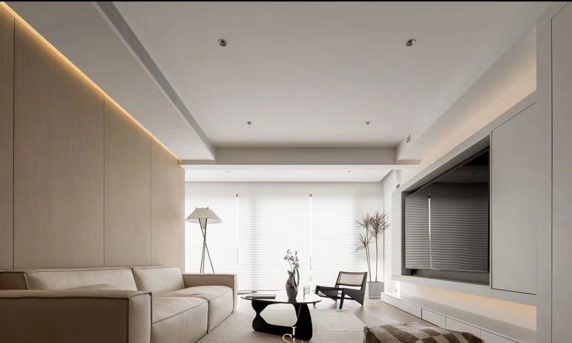 将留白注入日常,暖木色温柔点缀。内嵌筒灯和 局部隐形灯带实现照明和居家氛围感表达,落地 窗在百叶帘的加持下,大量引入自然光线,让客厅整体呈现出明净的底色。