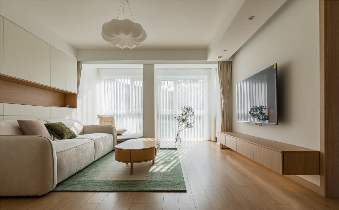客厅结合屋主的喜好,去繁就简,大面积的原木与纯白,晕染出空间的干净底色。