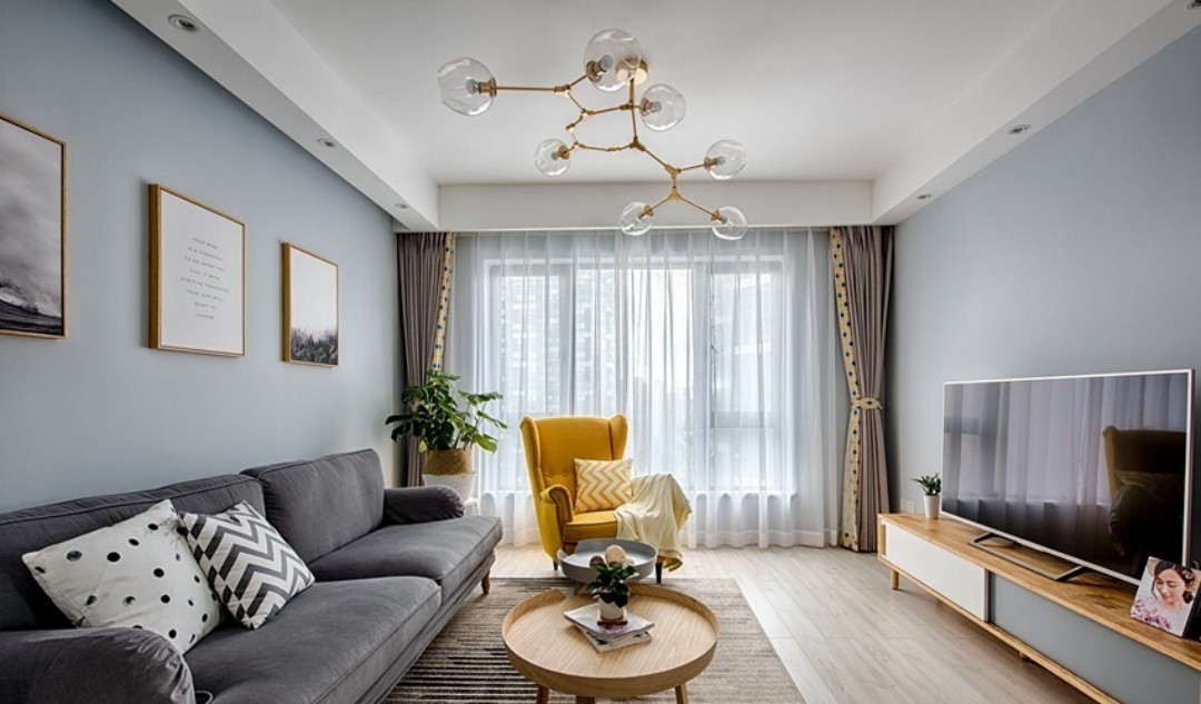 客厅整体色调为浅灰系,使空间柔和而恬静,也更适合于两口子的性格,与他们简单的生活方式所匹配,一把明黄色的单人沙发,一个白色的斗柜置于其中,又可以瞬间为这个灰色空间提供明亮与温暖。