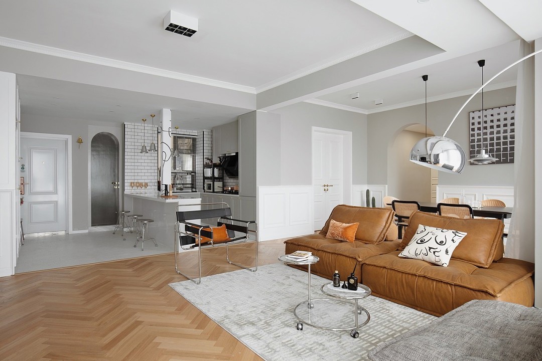 餐厅与客厅就以沙发作为空间划分界线,同样通铺木地板,两者有种相互融合有各自区分的空间感。半墙灰白墙+半墙石膏墙组合,与电视背景墙做了呼应,融入拱门形过道,让整个空间更加柔和美观,弧形元素的加入,充分展示了空间设计的魅力。