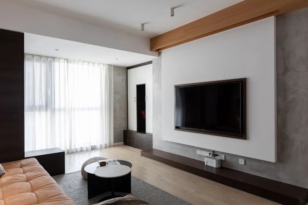客厅选用低饱和度配色,橡木吊顶搭配黑胡桃木柜体,清爽利落又不失家的温馨。客厅选用65英寸智能电视,同时还安装了投影仪,兼顾更多人的选择。沙发选择了做旧牛皮功能沙发,搭配黑白组合茶几,***又舒适。