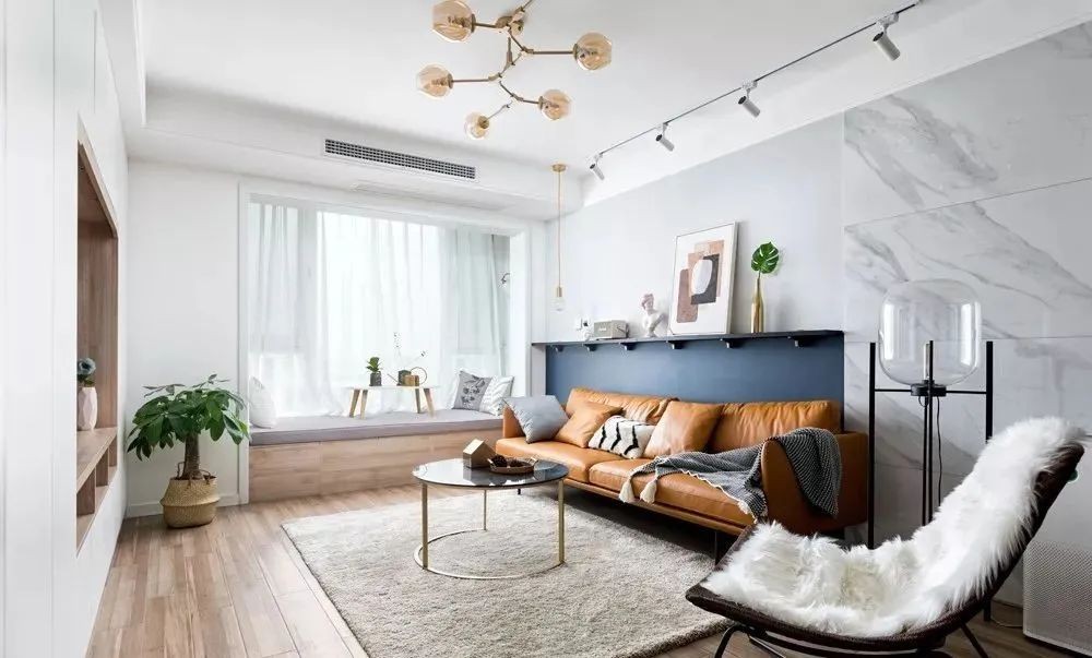 客厅,在阳台打造榻榻米做假飘窗,与橘黄色皮质沙发、棕色布艺躺椅,呈围合式布局,偶尔招待亲朋好友,三五个人围坐着聊天更加放松舒服。沙发墙采用黑白分色墙设计,并安装了搁板摆放饰品,加上一排射灯的点缀,精致有格调。电视墙定制了整面墙的收纳柜,加上无把手设计,既美观又实用。