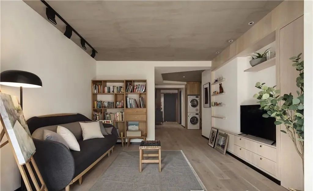 客厅,将顶面做挑高式处理,并涂刷了水泥艺术漆,自然纯朴有质感。电视墙定制了入墙式收纳柜,满足了客厅的收纳需求,且不占用空间。