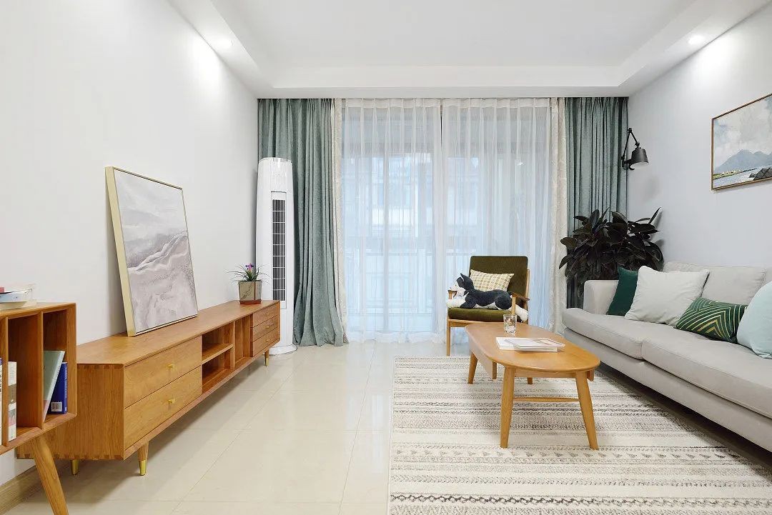 客厅,以白色和浅灰色为主调,辅助樱桃木色、墨绿色和烟灰蓝,营造出温馨自然、简洁明快的空间氛围。电视墙不做任何造型,简洁明了又大气。