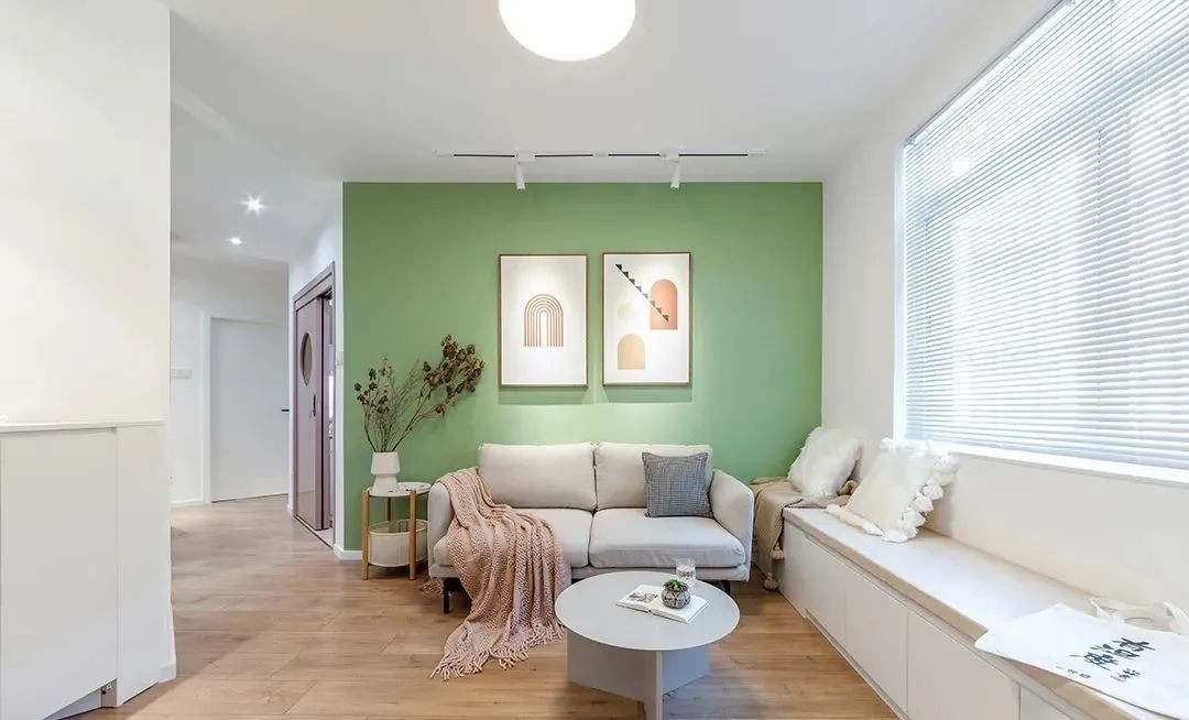 客厅,沙发墙选择清爽的抹茶绿乳胶漆,搭配浅灰色的双人沙发和小茶几,打造出简约小清新的格调。靠窗打造了一排可收纳的卡座,卡座与书桌结合,增加收纳和办公功能。