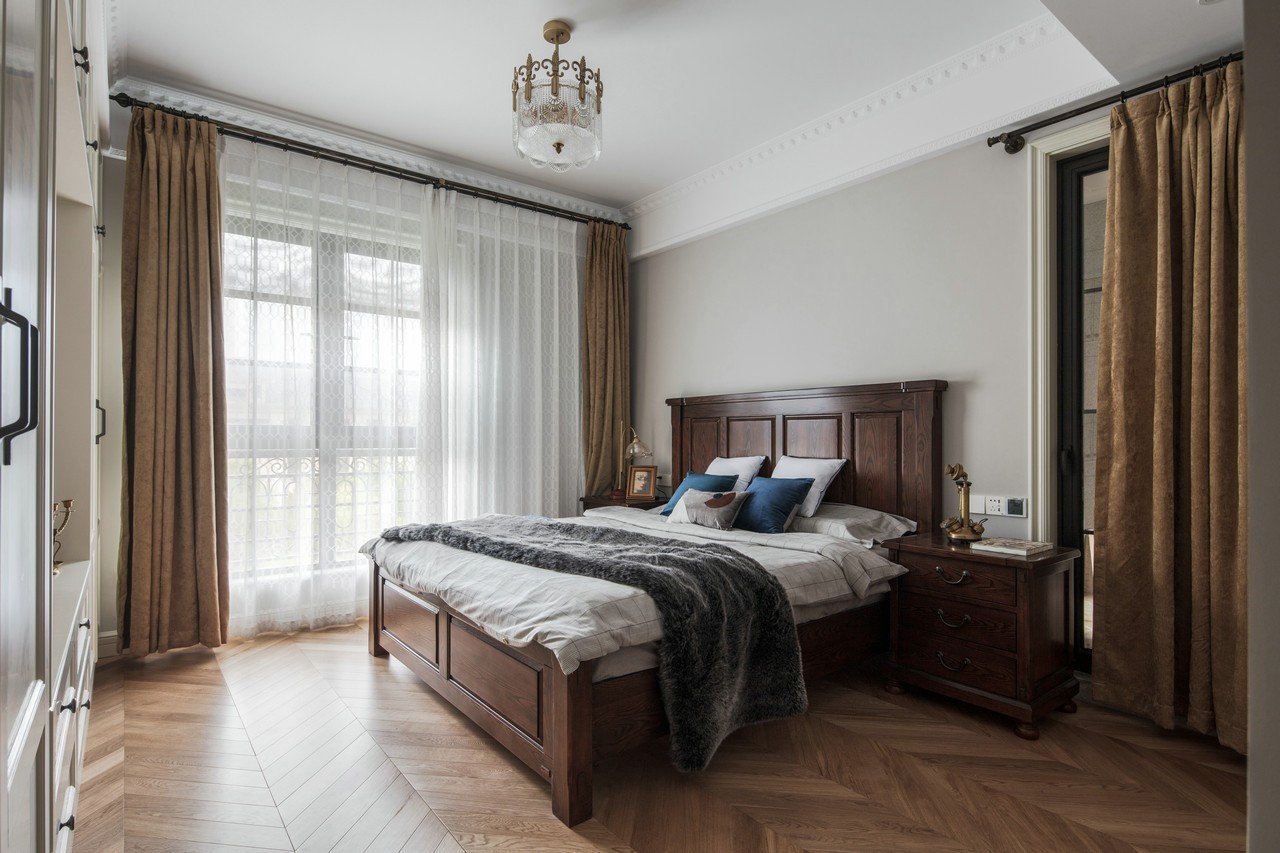 主卧的采光非常棒,落地窗的设置,大棕色的落地窗帘,带来厚实感与胡桃实木床体带来的感觉是一致的,有着严谨而稳重的质地。业主比较偏爱灰色调,从床品的选择可以看出来,灰色代表低调,格子代表严谨,而蓝色靠枕一点缀,内心的热情与奔放又不言而喻。大体可以看出男主人是一个闷骚的文艺暖男。
