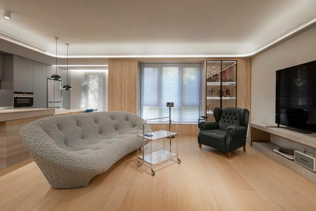 42m²的一体客餐厅足够大,设计师拓展了西厨的空间,来分散中厨的储物压力。