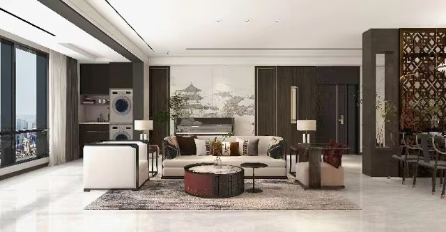 新中式风格的大平层设计客厅,镂空屏风隔断
