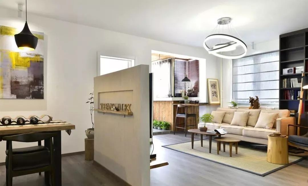 电视墙背后是餐厅,次卧房门移位后,餐厅空间更加独立完整。半墙隔断依电视尺寸打造的,两侧留出了空位,方便通行。