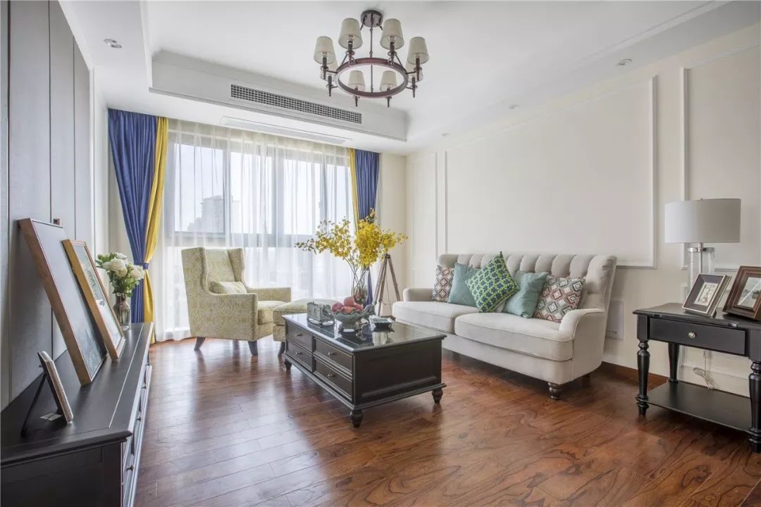 客厅褐色手抓纹实木地板、灰色的美式布艺沙发、高雅黑家具、嫩绿色单人沙发、蓝黄拼接棉麻窗帘构成了一个静谧的会客、休闲场所,舒适不失大气。
