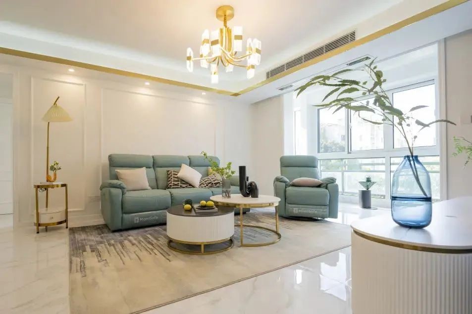 整个客餐厅看起来层次感很强,蓝色的皮沙发和灯具、茶几、餐桌上的金属线条和谐搭配,简约中又透露出时尚***的质感。