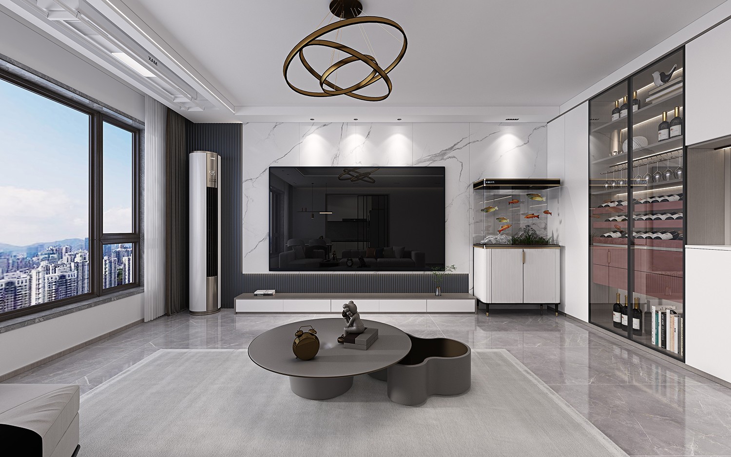 现代客厅,木制墙板搭配石材凑成大气的电视背景墙,满墙的酒柜也是足够收纳